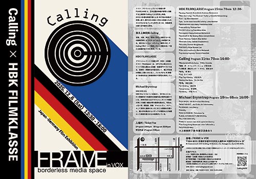ドイツ·ブラウンシュヴァイク美術大学FILMKLASSEと、日本全国から映像作家等と活動する上映団体Callingによる交流上映会。 23名 の多様な映像作家による36作品の映像が京都に集う。国や文化を越えて交わる映像たちが、それぞれのまなざしから世界を見つめ、映像表現の新たな可能性を探る