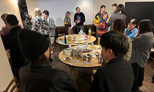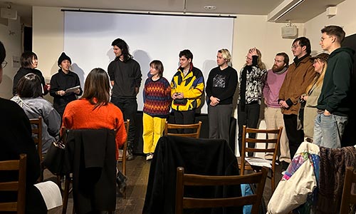 Die Calling Filmmaker Coop war kurz vor unserer Exkursion mit einigen Kurzfilmen zu Gast im Filmforum der HBK; im Rahmen unserer Exkursion fand nun unser Gegenbesuch mit gegenseitigen Filmvorführungen statt. Das Event im Mediaspace 'FRAME in VOX' wurde durch die Experimentalfilmer*innen Yüiho Umeoka und Yu-Jin Kim eröffnet; nach den drei Kurzfilm-Programmen gab es eine Reception mit Gelegenheit zum Austausch und Gespräch.